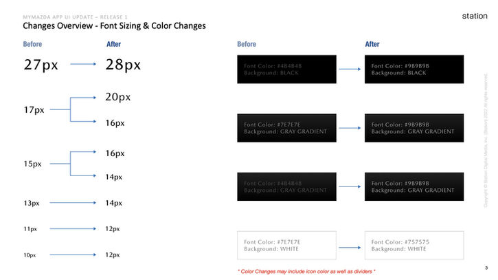Many users have complained that it is hard to read the MyMazda app in the old version, especially during the daytime, because the app has a dark mode design. The Mazda team prefers to keep the dark mode design to maintain their branding, but it did not consider accessibility design. Therefore, I conducted a "WCAG Test Comparison" deck following WCAG guidelines for mobile app design and UI specs on Figma for the development team. After explaining the issues to the Mazda team, we eventually received approval to modify the UI designs for better accessibility.